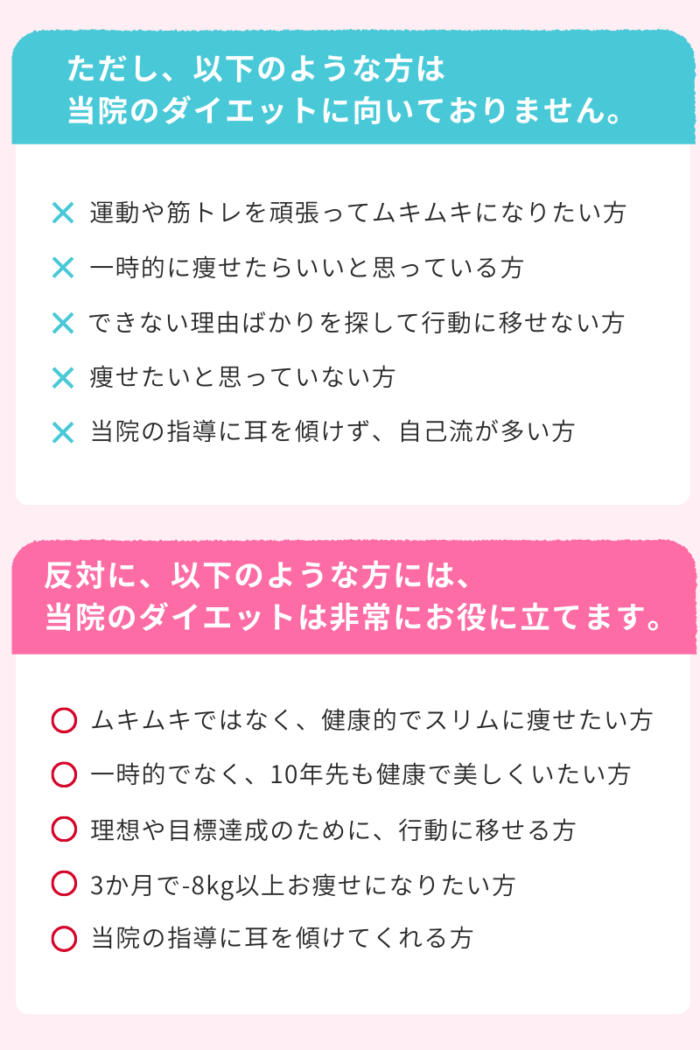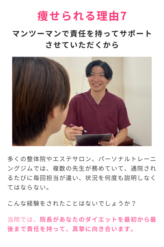 ダイエットを諦めていた方、何をやっても変わらなかった方の最後の砦となれるよう、お一人お一人に真剣に向き合っていきます。