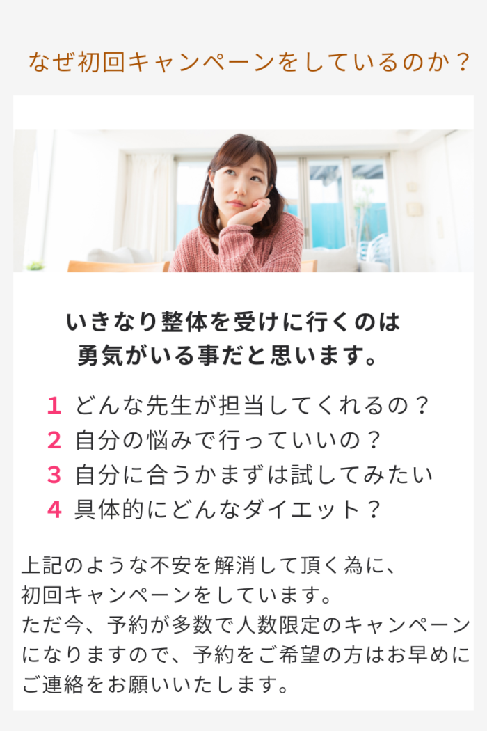 上記のような不安を解消して頂く為に、初回キャンペーンをしています。