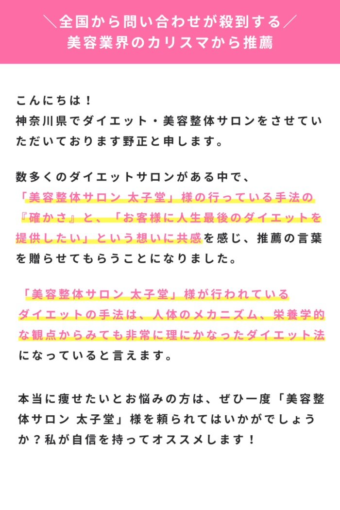 迷いなく「NO!」と即答できたのであれば、いますぐ美容整体サロン太子堂・ハンドメディスングループへご連絡ください。