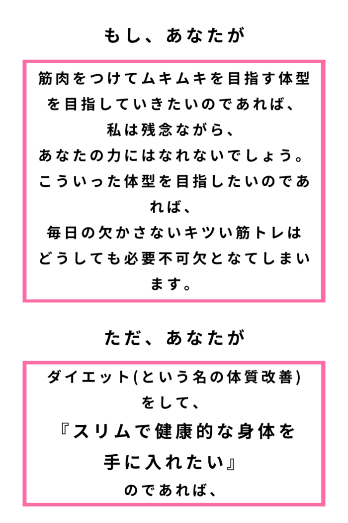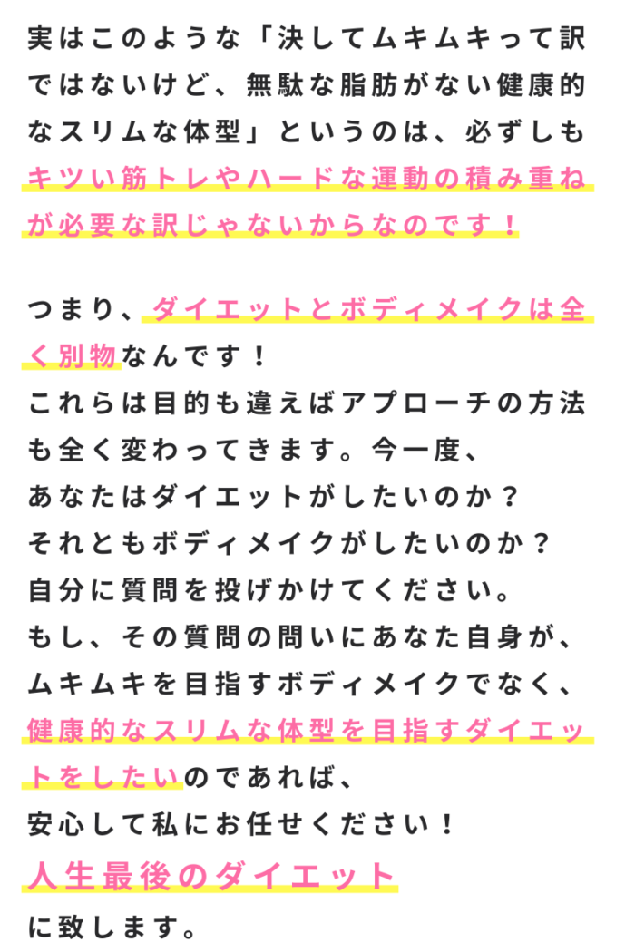 私はダイエットを通じて、健康になってもらい、見た目も綺麗に変われるきっかけになればと思い、体質改善に特化した根本改善ダイエットのサポートをさせて頂いております。