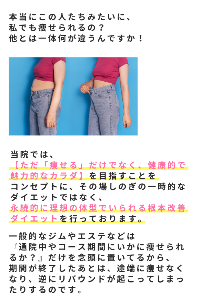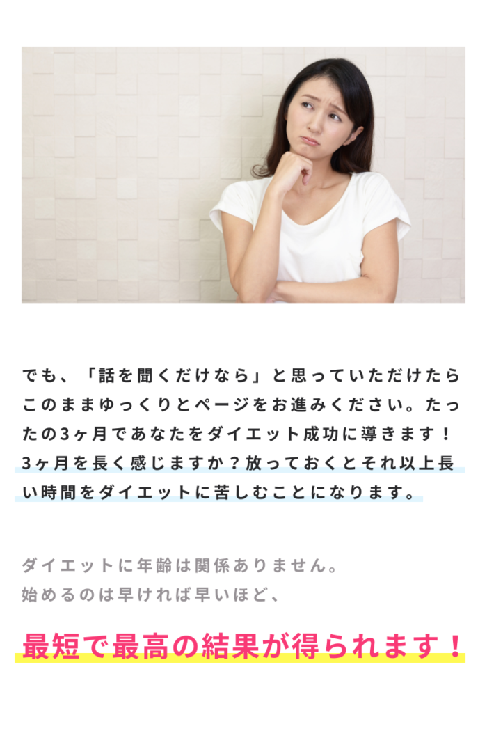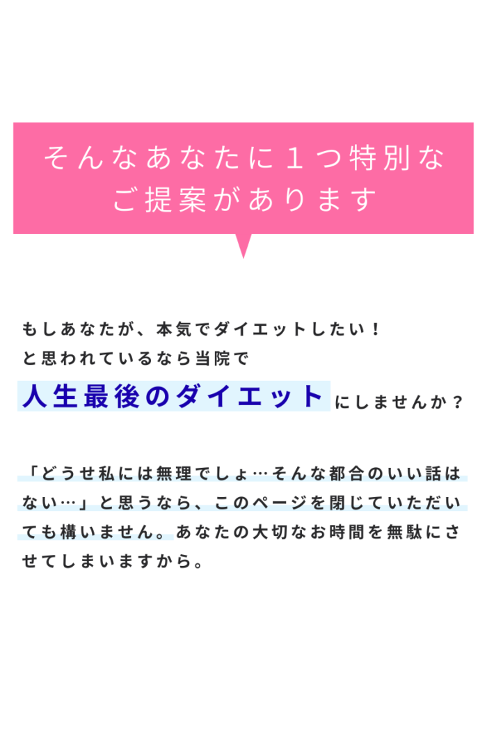 そのお悩み、諦めずに 当院にお任せください! あなたも「3ヶ月」で人生最後のダイエット に成功しませんか?