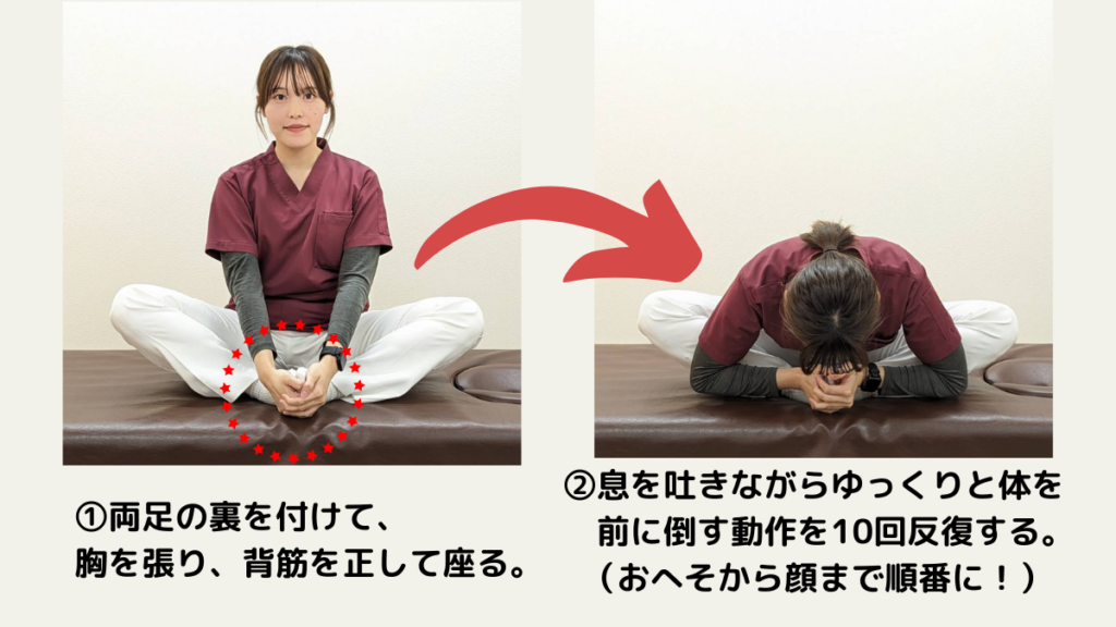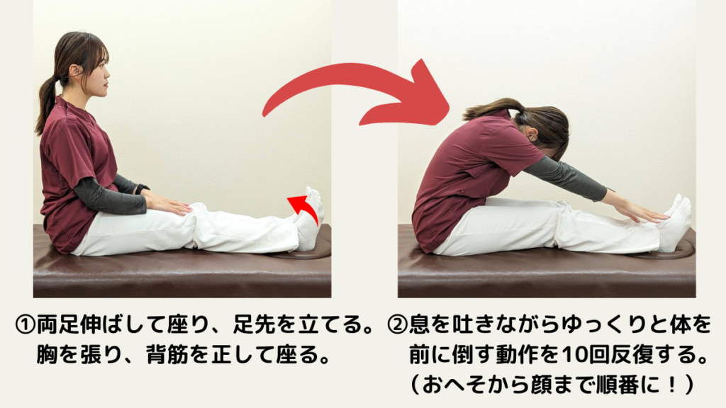 膝を伸ばした状態で座り、つま先を立てた状態から、身体を前に倒していきます。
