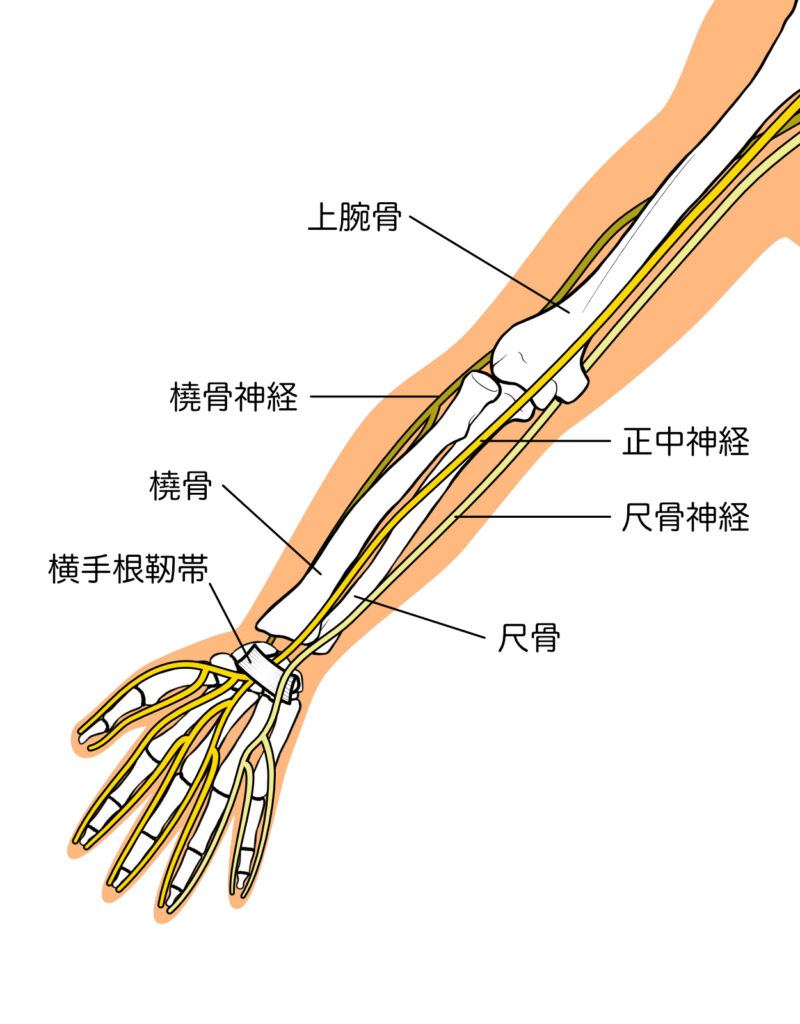肘の周辺では「尺骨神経」が肘の内側を、「橈骨神経」が肘の外側を通っています。