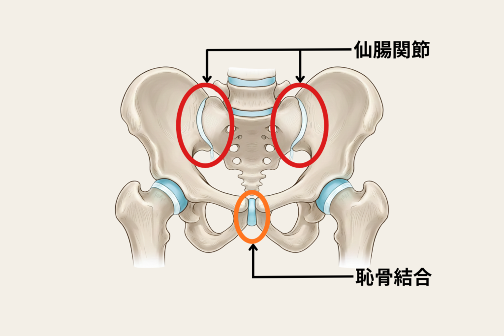 リラキシンの作用により、本来は動かないはずの「仙腸関節(=仙骨と腸骨をつなぐ関節)」や「恥骨結合(=骨盤の前側)」がグラグラと不安定になります。